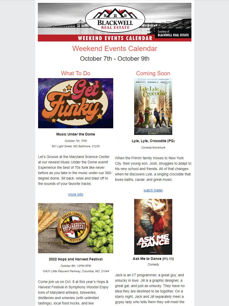 Our Blackwell Real Estate Monthly Newsletter is a professionally designed physical monthly mailer automatically printed and sent out to your database at the beginning of each month. It includes a great real estate article, cultural events in the D.C./Baltimore area, local sports schedules, and more!